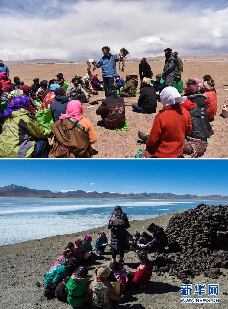 這是一張拼版照片:上圖為瑪曲鄉(xiāng)黨委書記朗卡江村(中)向參加活動的村民講解如何區(qū)分可回收垃圾與不可回收垃圾(2019年5月28日攝,新華社記者周錦帥攝);下圖為在海拔約5000米的西藏山南市浪卡子縣堆瓦村,駐村工作隊員貢曲(中)和次仁倉決(右一)給放假的孩子補習(xí)功課(2017年2月9日攝,新華社記者普布扎西攝)。新華社發(fā)