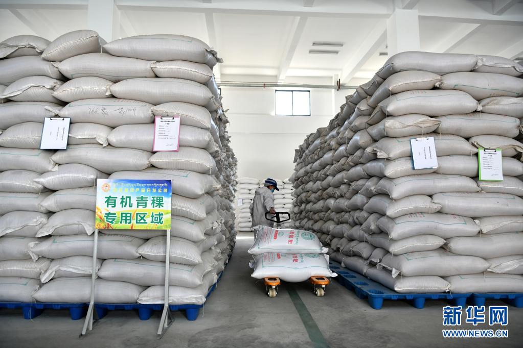 員工在洛宗特色產(chǎn)品開發(fā)公司的生產(chǎn)線上將烘炒好的青稞裝袋(7月24日攝)。新華社記者 李鑫 攝