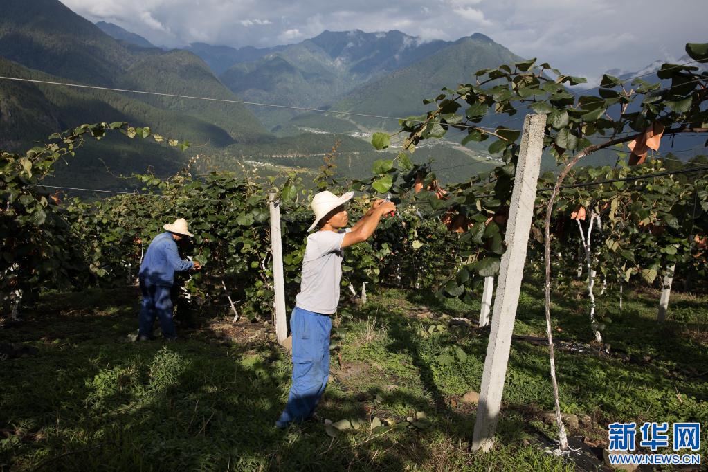 在西藏自治區(qū)林芝市察隅縣下察隅鎮(zhèn)京都村,獼猴桃園工作人員在修剪獼猴桃枝葉(7月22日攝)。京都村通過“公司+農(nóng)戶”模式引進(jìn)了獼猴桃種植,幫助村民增收。新華社記者 金立旺 攝