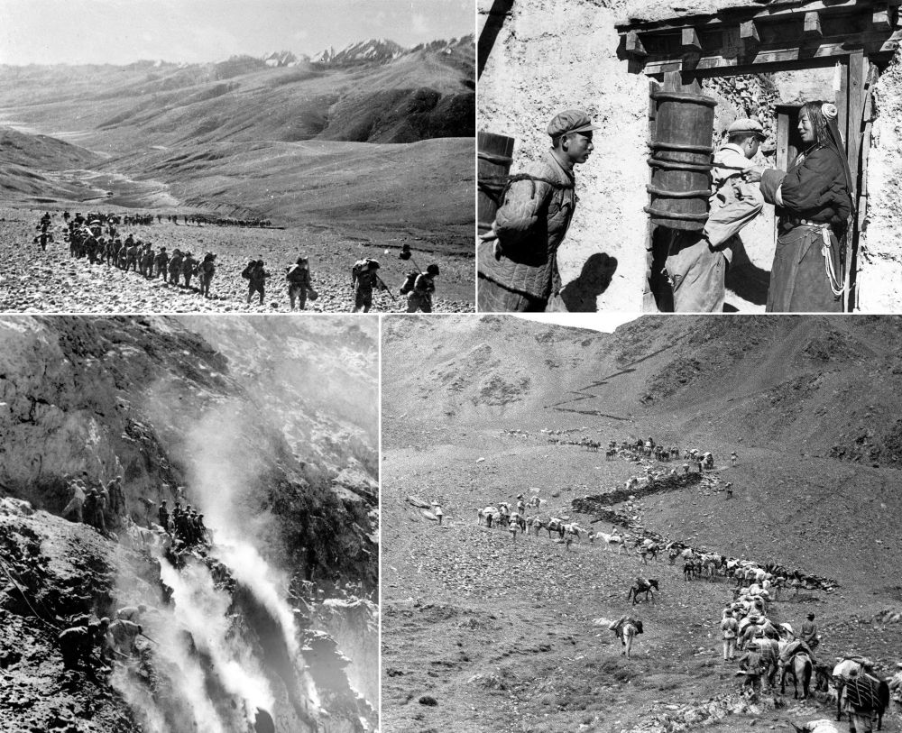 左上圖為1950年,人民解放軍戰(zhàn)士跋涉在高山峻嶺間向西藏前進(jìn)(資料照片);右上圖為人民解放軍戰(zhàn)士在執(zhí)勤空隙為藏族老百姓背水(資料照片,張正模攝);左下圖為筑路戰(zhàn)士在懸崖絕壁上修建川藏公路(資料照片);右下圖為1951年7月,解放軍第十八軍進(jìn)藏先遣部隊(duì)行進(jìn)在瓦合山上(新華社記者袁克忠攝)。