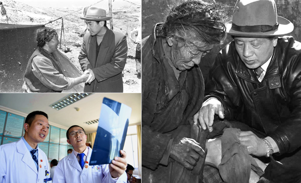 左上圖為來自陜西的援藏干部、阿里日土縣副縣長(zhǎng)賈冗勇深入牧區(qū),幫助藏族牧民解決生產(chǎn)、生活的實(shí)際困難(新華社記者土登攝,1997年11月11日發(fā));左下圖為2017年8月3日,北京積水潭醫(yī)院援藏醫(yī)生龔曉峰(右)和北京天壇醫(yī)院援藏醫(yī)生李家謀在拉薩市人民醫(yī)院骨科病房?jī)?nèi)查看患者的X光片,進(jìn)行工作交接(新華社記者晉美多吉攝);右圖為孔繁森(右)在阿里日土縣過巴鄉(xiāng)為孤寡老人益西卓瑪治病(新華社記者土登攝,1994年12月26日發(fā))。