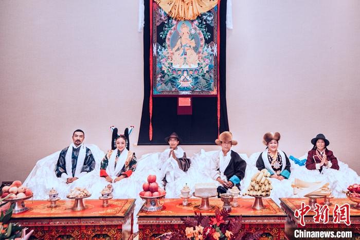 資料圖為德吉卓瑪(左二)和先生德格葉(左一)在婚禮上的照片。中新社發(fā) 德吉卓瑪供圖