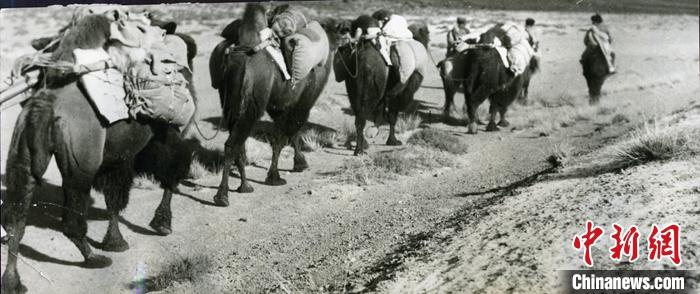 資料圖為1953年11月,西藏運(yùn)輸總隊(duì)駝工往西藏徒步運(yùn)輸物資。 中新社發(fā) 莫河駱駝場(chǎng)歷史陳列館 供圖