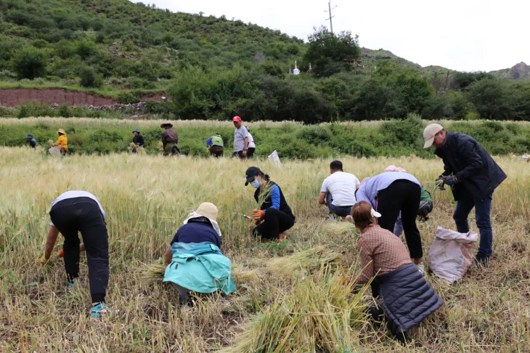 在向巴桑丁、向巴曲西兩戶群眾的青稞地里,市委統(tǒng)戰(zhàn)部干部職工高挽袖子,手握鐮刀,忙碌起來,干活一個比一個有勁,像是在參加比賽。收割中,會干農(nóng)活的成了“師傅”,一邊做示范一邊向“徒弟”們解說割青稞技巧。
