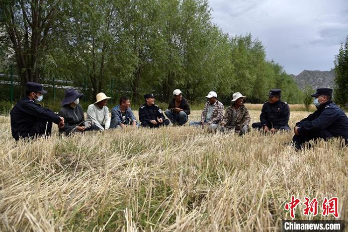 一陣忙碌過后,大家圍攏在田里聊變化說發(fā)展。慶祝西藏和平解放70周年大會(huì)剛剛舉行,大家聊著現(xiàn)場(chǎng)觀禮、收聽收看的感受。參加現(xiàn)場(chǎng)大會(huì)的民警高揚(yáng)向大家分享現(xiàn)場(chǎng)感受,講述自己在西藏生活學(xué)習(xí)工作22年的發(fā)展變化和入警初心。歡聲笑語過后,大家又忙碌起來。田間地頭藏青藍(lán)的身影,與金黃麥地構(gòu)成一幅加強(qiáng)民族團(tuán)結(jié)、警民魚水情深的動(dòng)人畫卷。
