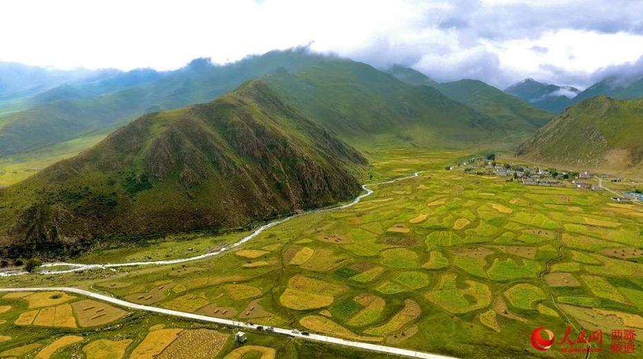 無人機(jī)鳥瞰青稞田地。人民網(wǎng) 次仁羅布攝
