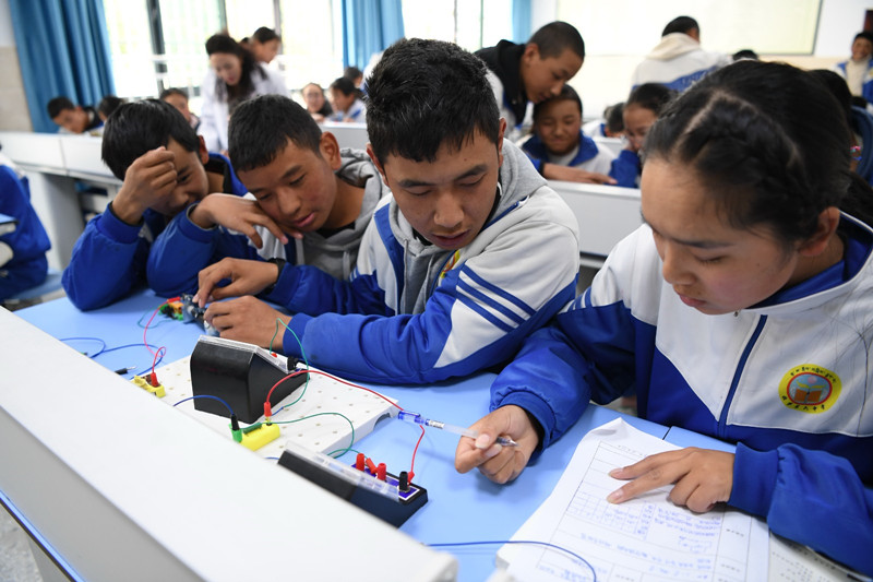 圖為拉薩市第六中學(xué)的學(xué)生們正在物理實驗室做電阻實驗。記者 唐斌 次旺 攝
