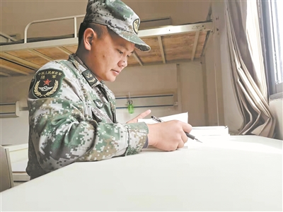 吳杰在宿舍寫(xiě)日記。圖片由巴弄卓康哨所官兵提供