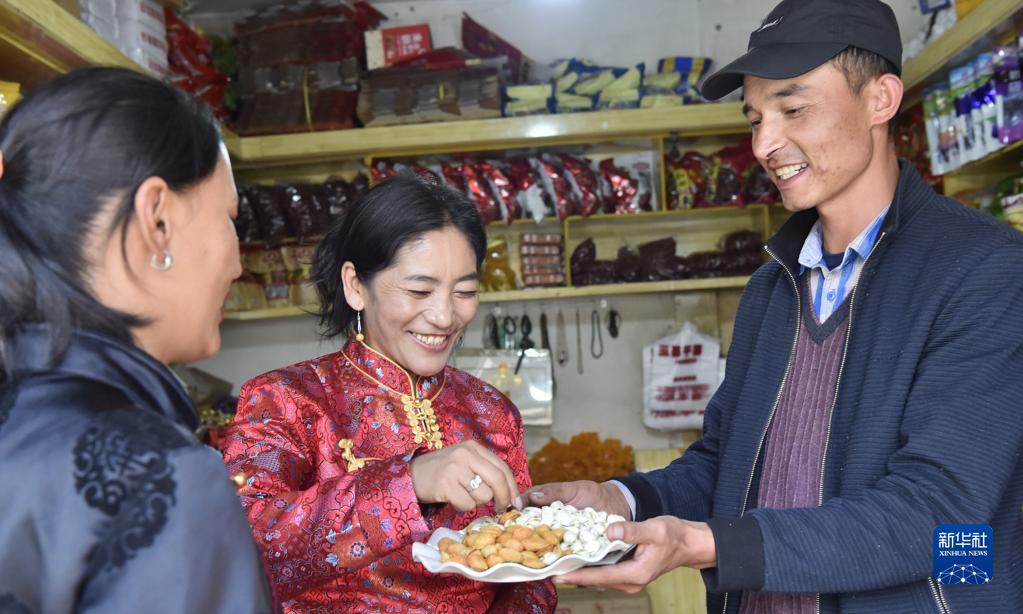 阿卜杜杰力力·麥提如剛(右)于2010年從新疆和田墨玉縣來到西藏阿里獅泉河鎮(zhèn)做干果生意,并融入到獅泉河鎮(zhèn)藏布居委會(huì)的民族大家庭中。圖為阿卜杜杰力力·麥提如剛請(qǐng)當(dāng)?shù)夭刈迮笥哑穱L來自家鄉(xiāng)的特產(chǎn)(9月22日攝)。新華社發(fā)(索朗羅布 攝)