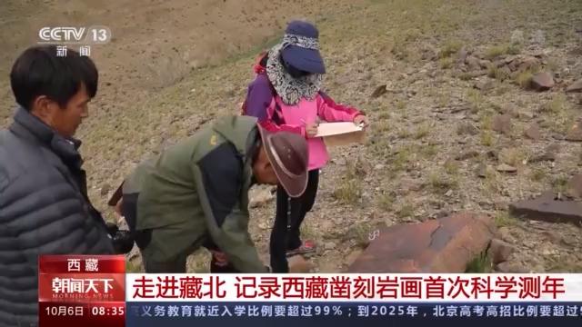 總臺記者 陳琴:現(xiàn)在我們是跟隨科考隊員來到了海拔4700米的加林山巖畫這么一個分布區(qū)域,這里的位置就是在尼瑪縣榮瑪鄉(xiāng)依布茶卡鹽湖的旁邊,我們看見科考隊員正在對這幅巖畫進(jìn)行登記和記錄。