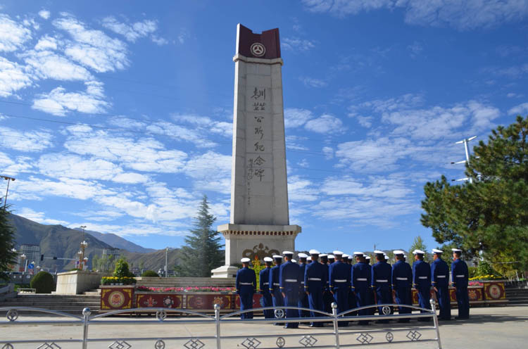 圖為西藏森林消防總隊特勤大隊在青藏川藏公路紀念碑前緬懷先烈。