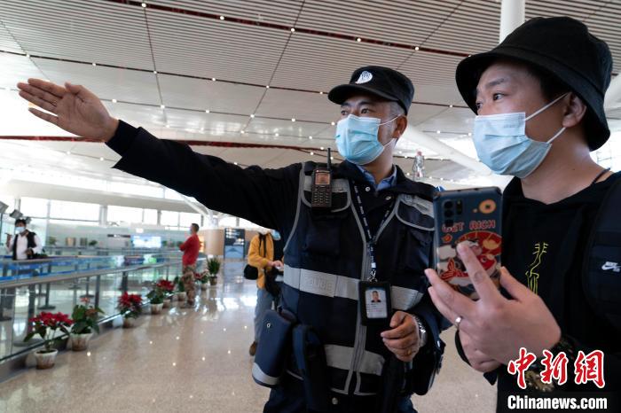 圖為機(jī)場(chǎng)安保人員為旅客提供服務(wù)。程征宇 攝