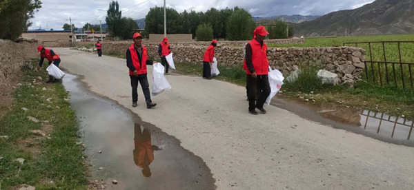 穿紅色馬甲的志愿者維護(hù)村容村貌。 圖由拉孜縣宣傳部提供