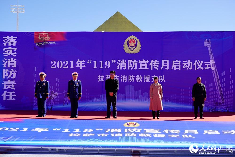 拉薩市2021年“119”消防宣傳月啟動(dòng)儀式現(xiàn)場(chǎng)。拉薩市委常委 、常務(wù)副市長(zhǎng)占堆(左三)出席儀式并講話。人民網(wǎng) 次仁羅布攝