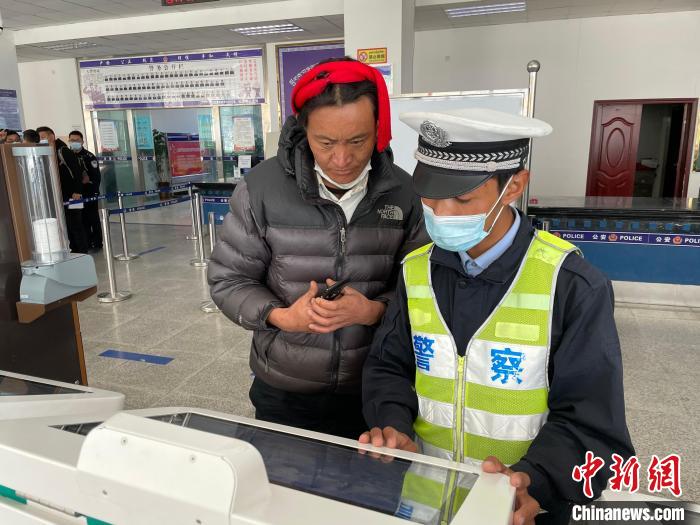 圖為輔警扎加引導(dǎo)農(nóng)牧民辦理業(yè)務(wù)。趙朗 攝