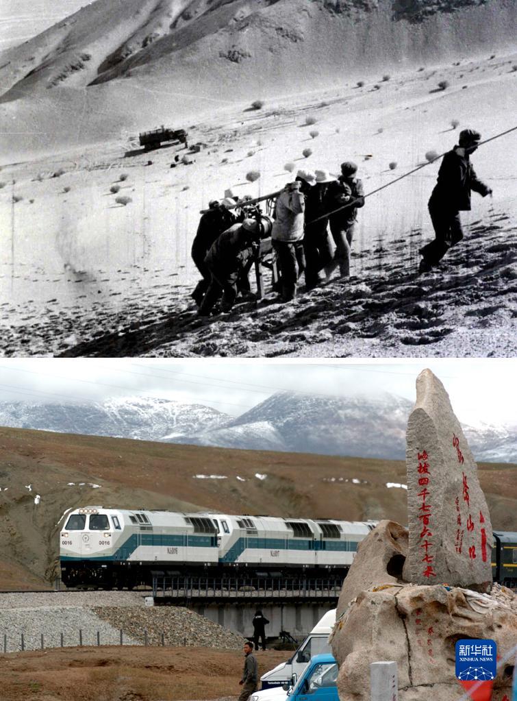 拼版照片:上圖為20世紀(jì)50年代拍攝的勘測(cè)青藏線的資料照片;下圖為2006年7月1日,青藏鐵路全線通車。這是從格爾木出發(fā)的“青1”次列車經(jīng)過海拔4767米的昆侖山口(新華社記者侯德強(qiáng)攝)。新華社發(fā)