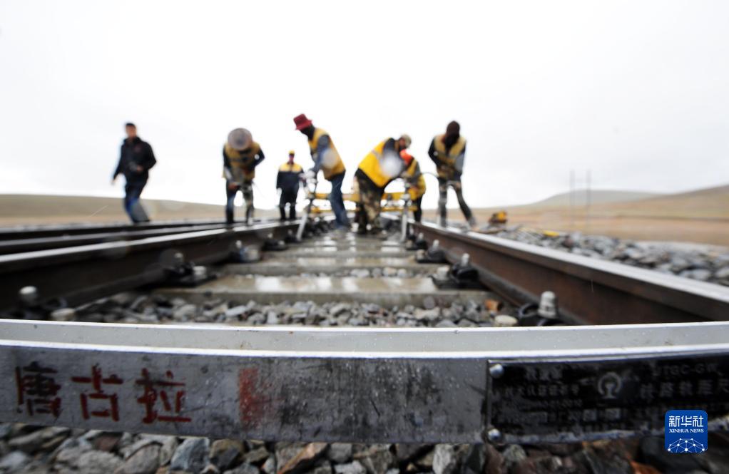 2018年6月30日,在青藏鐵路唐古拉站附近,養(yǎng)路工人冒雨對(duì)路軌進(jìn)行搗固作業(yè)。新華社記者 侯德強(qiáng) 攝