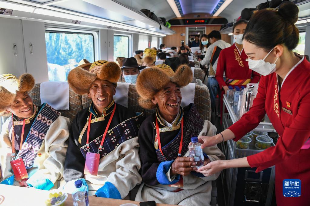 2021年6月25日,全長435公里、設(shè)計(jì)時(shí)速160公里的拉林鐵路建成通車,西藏首條電氣化鐵路建成,同時(shí)復(fù)興號(hào)實(shí)現(xiàn)對(duì)31個(gè)省區(qū)市全覆蓋。這是6月25日列車員向乘坐首趟復(fù)興號(hào)高原內(nèi)電雙源動(dòng)車組的乘客遞水。新華社記者 普布扎西 攝