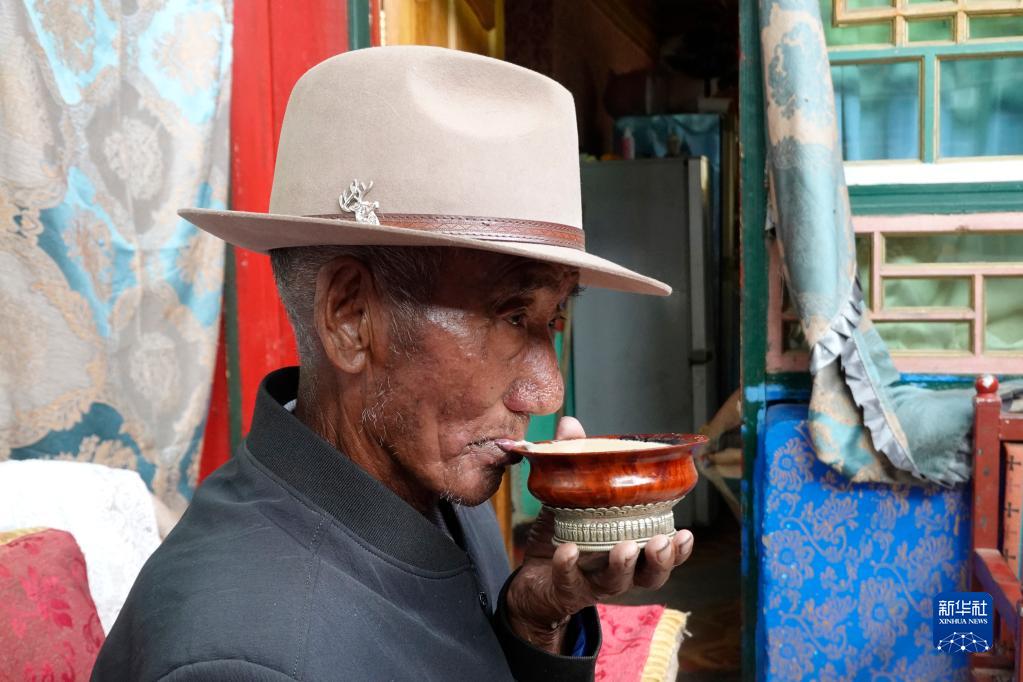 小多列老人在家里喝酥油茶(6月23日攝)。新華社記者 金一清 攝