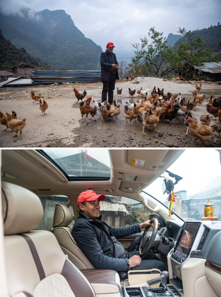 拼版照片:上圖為,陳塘鎮(zhèn)的致富帶頭人拉巴塔杰給養(yǎng)雞場(chǎng)的散養(yǎng)雞喂食;下圖為,拉巴塔杰坐在自己致富后購(gòu)買(mǎi)的越野車(chē)內(nèi)(均為11月25日攝)。 新華社記者 孫瑞博 攝