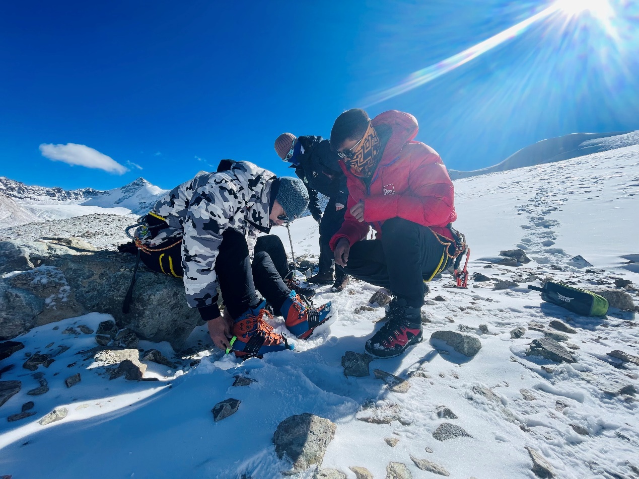 抵達洛堆峰5600米雪線的位置,三位二十歲出頭的年輕人熟練地在積雪冰壁上打起冰錐,固定路繩,他們在給這些遠道而來的體驗者設(shè)置技能訓(xùn)練路線。