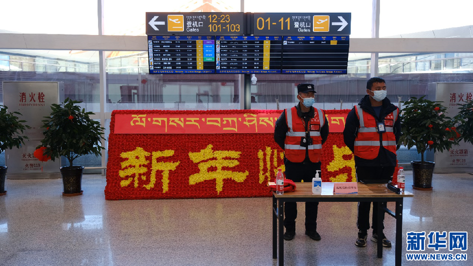 圖為拉薩貢嘎機場T3航站樓內(nèi)志愿者服務點(1月17日攝)。新華網(wǎng) 柑丹鴦琦 攝