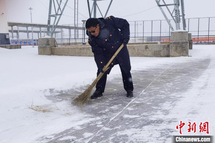 那曲火車(chē)站工作人員掃雪保障旅客出行安全。王志先 攝