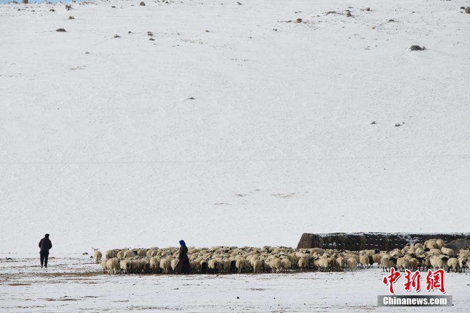 1月26日,牧民在納木錯湖邊放牧。雪后的西藏納木錯銀裝素裹,美景如畫。 中新社記者 貢嘎來松 攝
