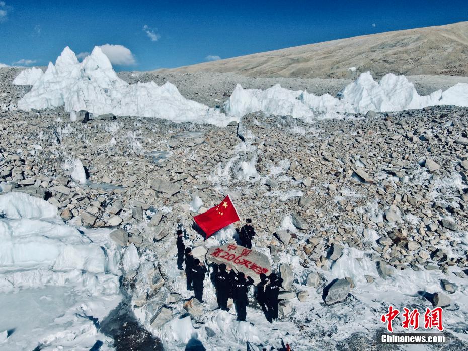 圖為普瑪江塘邊境派出所移民管理警察在邊境冰川巡邏期間向國(guó)旗敬禮。 索朗次旺 攝