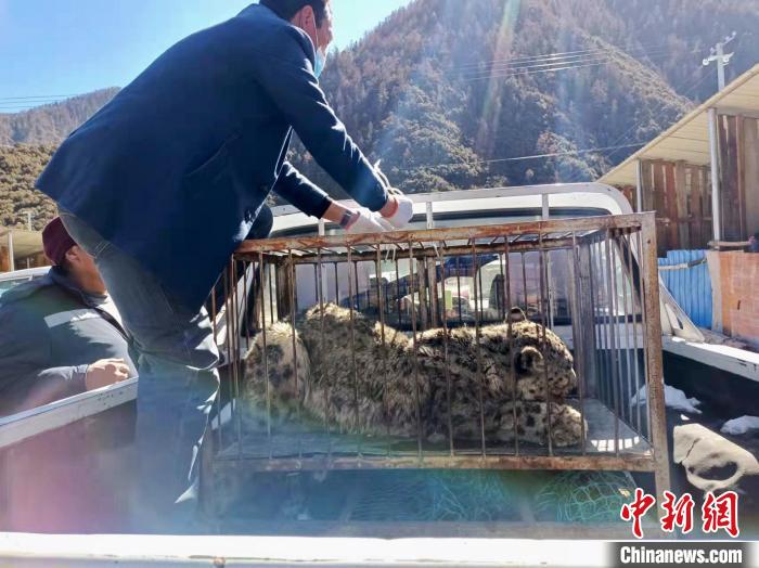 圖為工作人員將雪豹運(yùn)送至林芝市野生動(dòng)物收容救護(hù)站。 林芝市林草局供圖