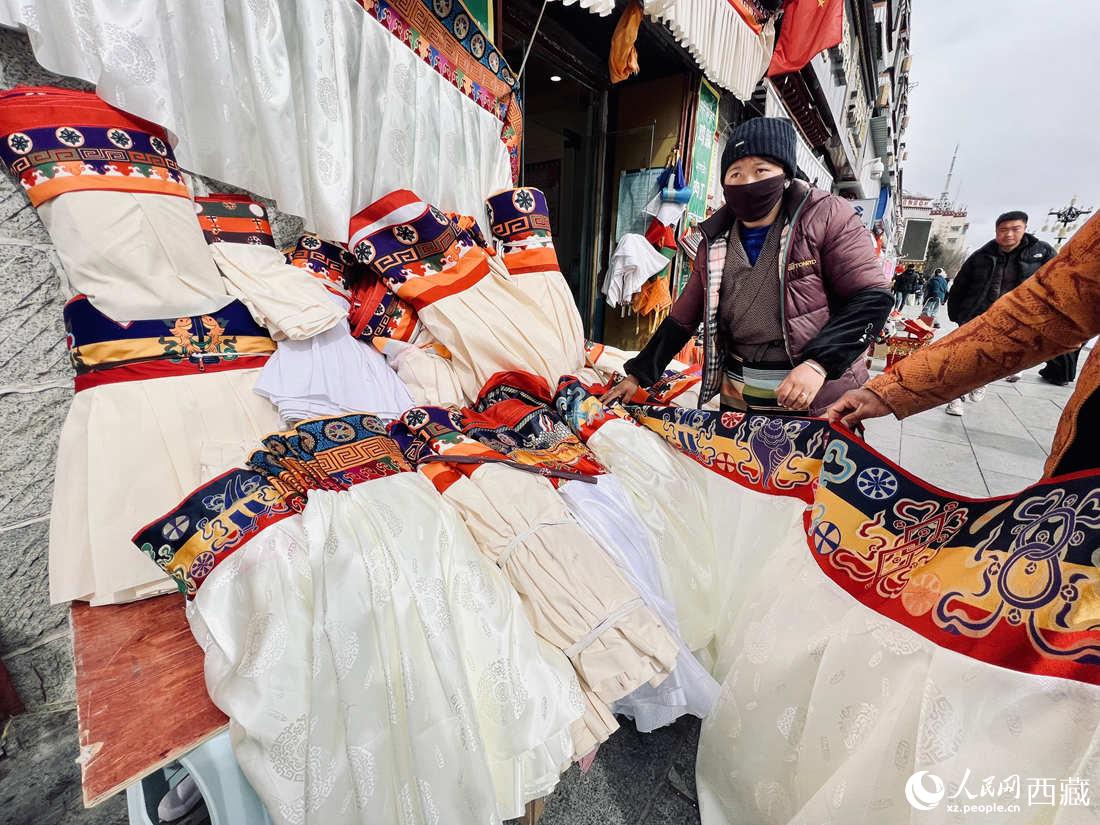 賣家按照要求為客戶裁量“香布”長度。(藏式建筑的一種特殊裝飾,懸掛在門窗上部,通?!跋悴肌睘橐荒暌粨Q,祈求新的一年吉祥如意。)人民網(wǎng) 次仁羅布攝