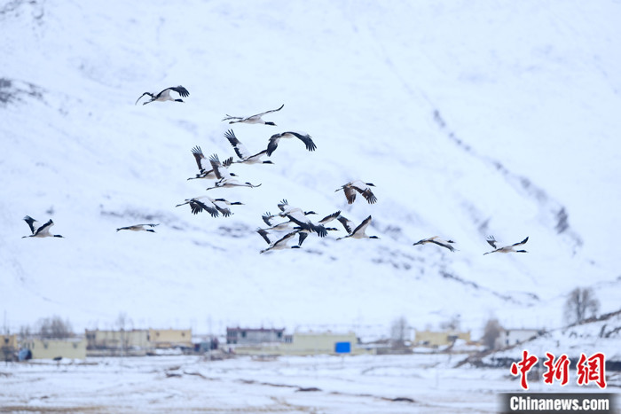 圖為2月23日,西藏林周縣虎頭山水庫(kù)附近村莊上空,一群黑頸鶴飛過(guò),遠(yuǎn)處白雪皚皚。中新社記者 江飛波 攝