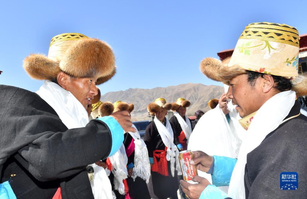 3月3日,西藏山南市貢嘎縣崗堆鎮(zhèn)農(nóng)民互相敬酒,慶賀藏歷水虎新年。新華社記者 覺(jué)果 攝