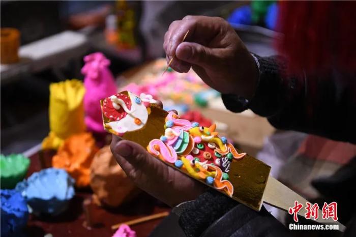 2022年2月14日,酥油花手工藝人在拉薩八廓古城現(xiàn)場(chǎng)制作。藏歷新年臨近,酥油花在年貨市場(chǎng)熱銷。酥油花在藏語(yǔ)中稱為“孜扎”,是古時(shí)藏傳佛教信眾因冬季沒有鮮花供佛而發(fā)明的替代品,如今已是藏族老百姓家庭中必備的年貨之一。中新社記者 貢嘎來(lái)松 攝
