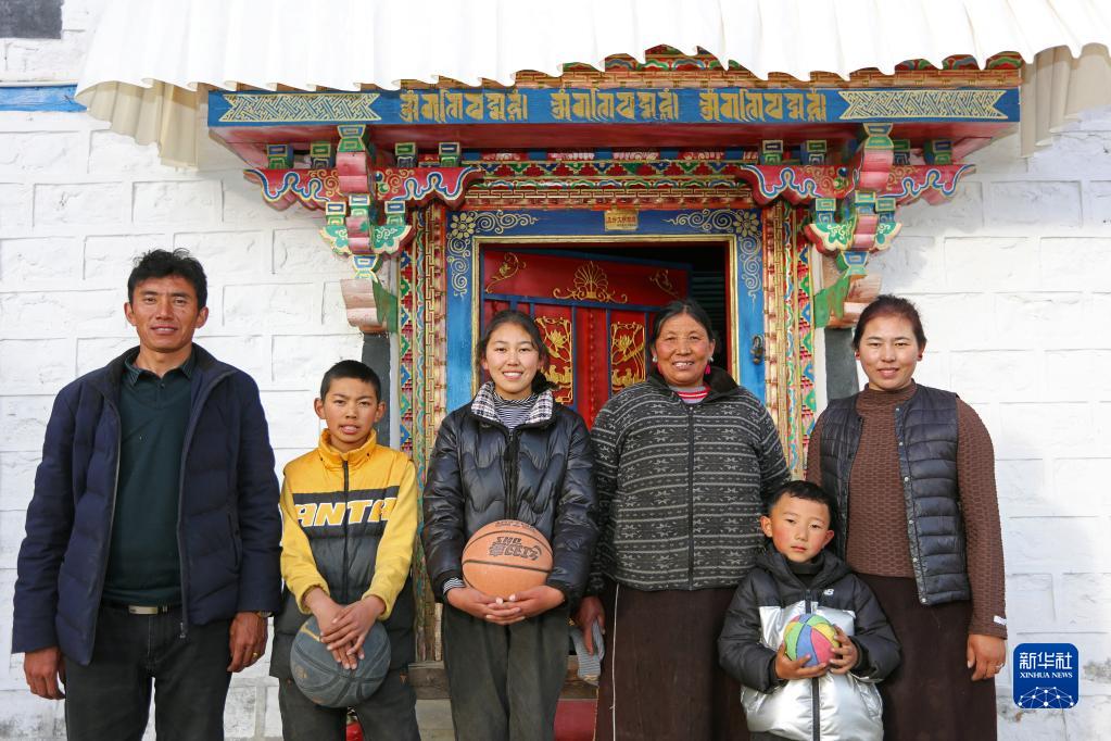 西藏自治區(qū)林芝市嘎拉村村民達(dá)瓦堅(jiān)參(左一)一家在家門口合影(2022年2月23日攝)。新華社記者姜帆 攝