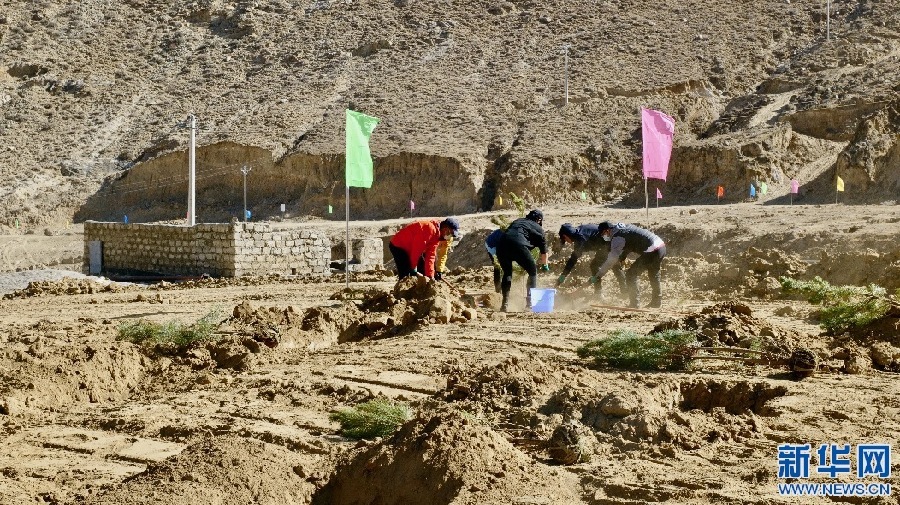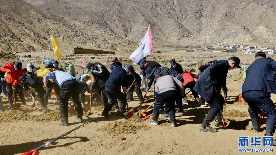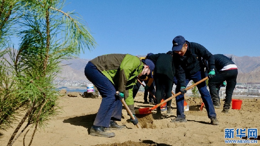 3月15日,西藏銀行員工正在進(jìn)行植樹比賽。新華網(wǎng) 柑丹鴦琦 攝