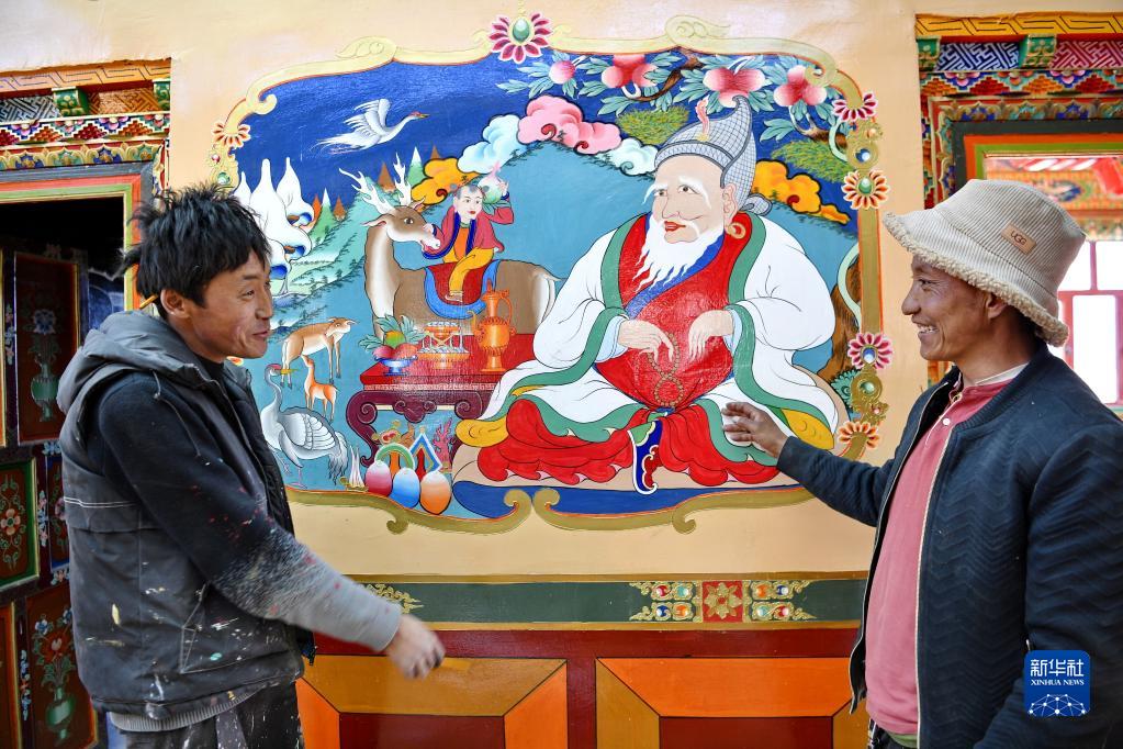 在湘河水庫(kù)移民新村,搬遷群眾拉巴旦增(右)與為自家新居繪制壁畫的民間藝人普布次仁交流(3月27日攝)。新華社記者 張汝鋒 攝