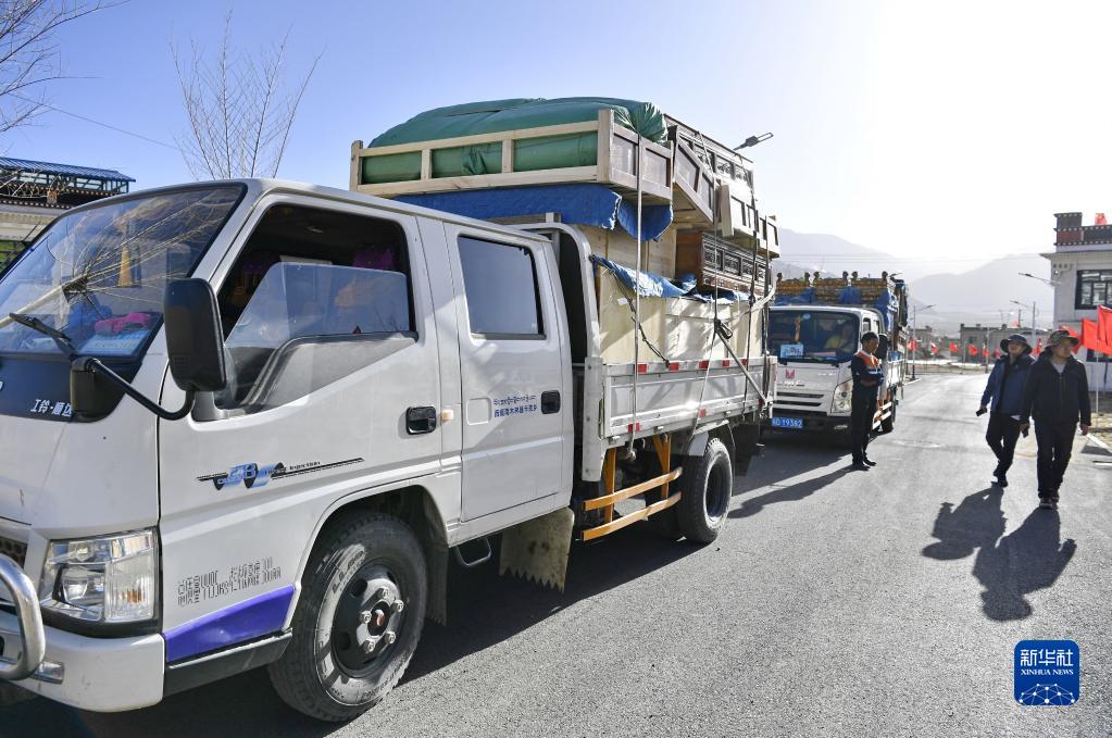 為搬遷群眾運(yùn)送家具的車輛駛?cè)胂婧铀畮?kù)移民新村(3月27日攝)。新華社記者 張汝鋒 攝