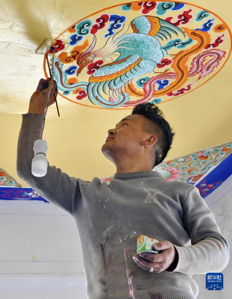 來自日喀則的民間藝人在湘河水庫(kù)移民新村一處民居繪制屋頂(3月27日攝)。新華社記者 張汝鋒 攝