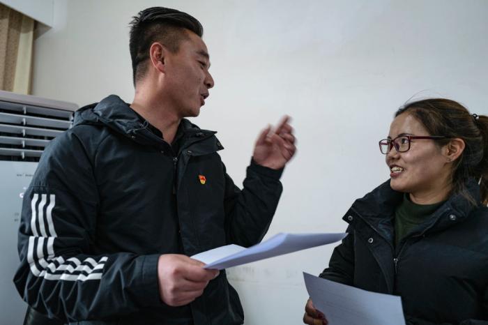鐵忠福(左)在昂仁縣與同事交流工作(2021年12月21日)。新華社記者 孫瑞博 攝