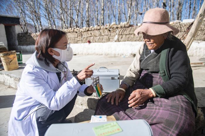 倉木拉(左)叮囑村民要按時吃藥(2021年12月21日攝)。新華社記者 孫瑞博 攝