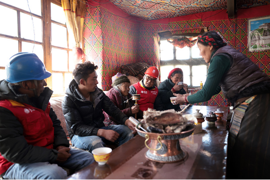 帳篷里大家圍坐在一起,喝著熱氣騰騰的酥油茶,熱情的讓卓不停地向服務隊隊員獻上脆脆的風干肉,有說有笑。讓卓85歲的老奶奶瑪姆也湊起熱鬧聊家常,即使聽力有些下降,但聊到用電給生活帶來的改變時,老奶奶笑著用流利的藏語說“黨的政策好??!”