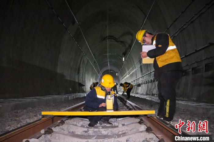 圖為鐵路大型養(yǎng)路機械搗固車在西藏拉林鐵路隧道內(nèi)。祁國慶 攝
