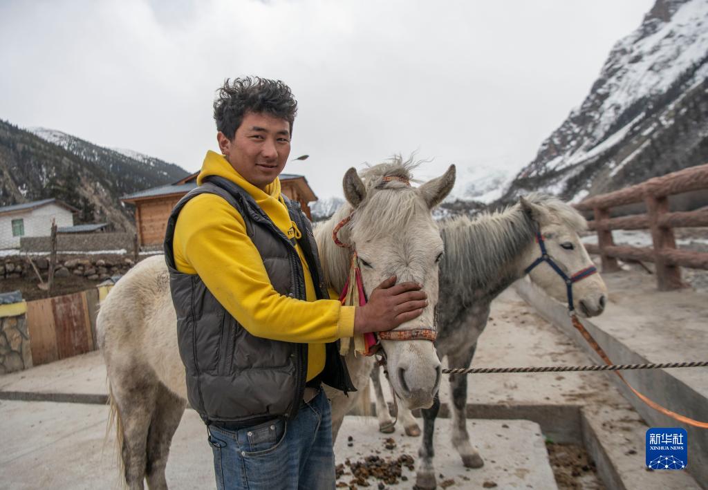 “慢慢來(lái),別摔了?!?8歲的江阿羅布把一名游客扶上馬,帶他前往離村不遠(yuǎn)的米堆冰川參觀。