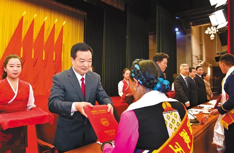 4月29日上午,西藏自治區(qū)慶?!拔逡弧眹H勞動節(jié)暨表彰大會在拉薩舉行。自治區(qū)黨委書記王君正出席會議并講話。這是王君正為受表彰代表頒獎。記者 旦增西旦 攝