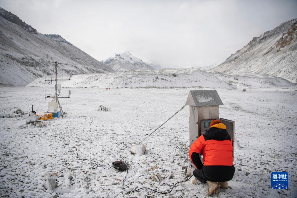 在珠峰登山大本營,科研人員給激光測風(fēng)雷達(dá)布線(4月30日攝)。新華社記者 孫非 攝