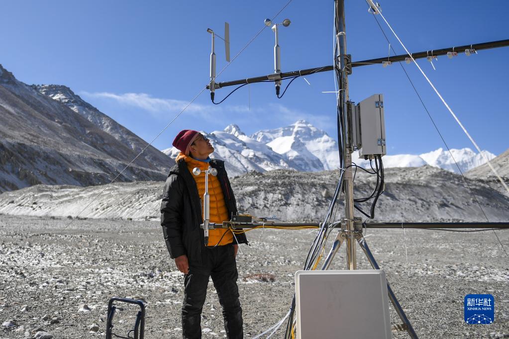 5月3日,在珠峰登山大本營,科研人員檢查微波輻射計(jì)。新華社記者 姜帆 攝