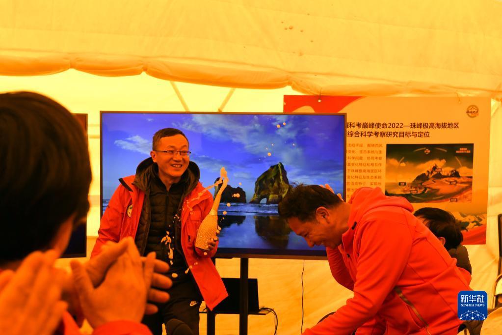 當(dāng)日凌晨3點(diǎn),科考隊(duì)員從珠峰海拔8300米的突擊營地開始沖頂。他們在海拔8830米處,架設(shè)了世界海拔最高自動氣象站,并在8848.86米的巔峰,利用高精度雷達(dá)測量冰雪厚度。任務(wù)一個接一個順利完成,珠峰大本營“巔峰使命”總指揮會議室?guī)づ窭铮娮C這一盛舉的科學(xué)家和工作人員的掌聲、喝彩聲,一次比一次響亮。