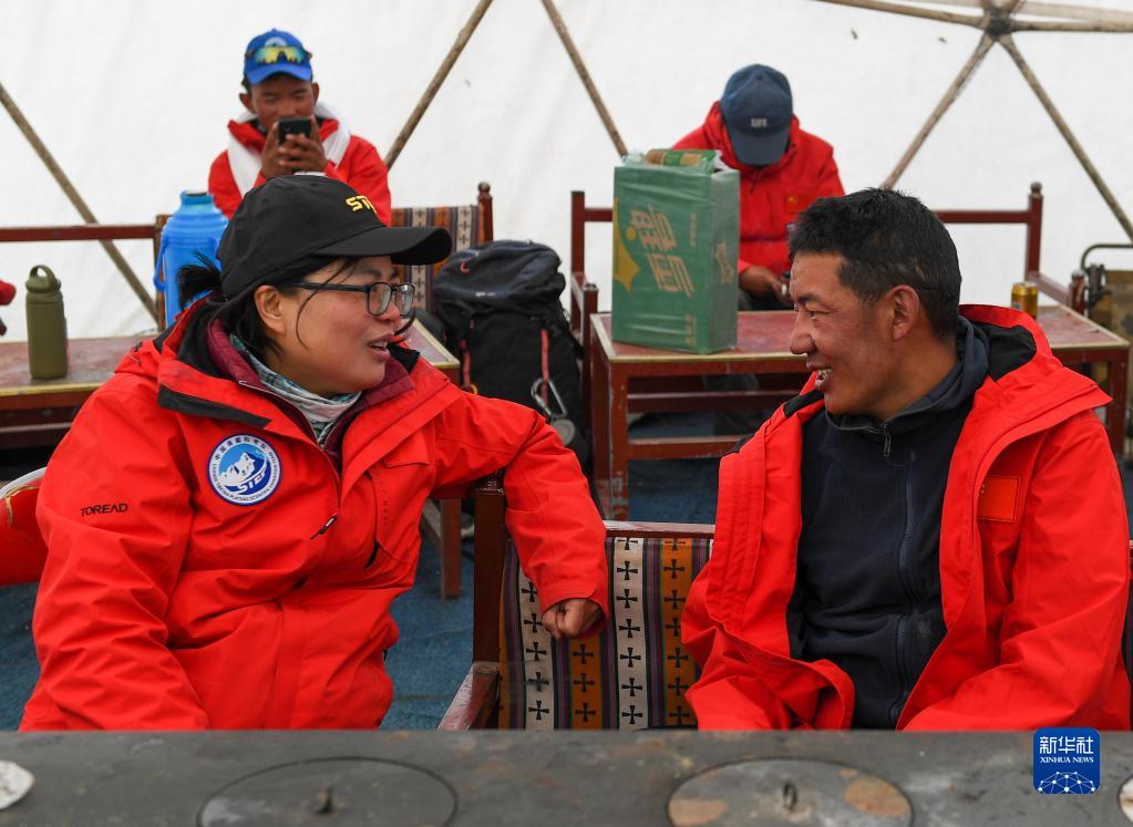 蘭州大學(xué)泛第三極環(huán)境中心劉勇勤教授(左)與順利返回大本營(yíng)的登頂科考隊(duì)員德慶歐珠交流情況。(5月5日攝)。新華社記者 姜帆 攝