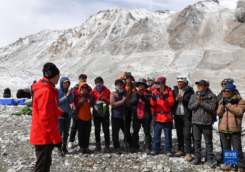 在珠峰登山大本營,冰川與污染物科考小組負責人康世昌(左一)在做行前動員(5月1日攝)。新華社記者 姜帆 攝